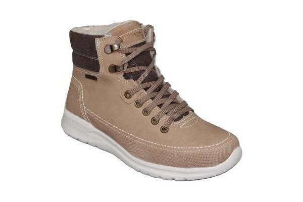 Dámská kotníčková zateplená obuv na tkaničku, kožený svrch světle hnědé barvy. Výška podešve 2,5 cm.